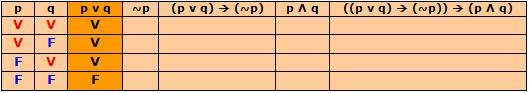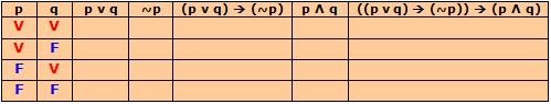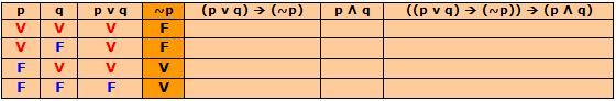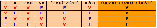 Veja como se procede a construção de uma tabela-verdade da proposição composta P(p, q) = ((p ⋁ q) → (~p)) → (p ⋀ q), onde p e q são duas proposições simples.