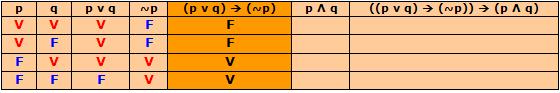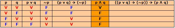 e) Valores lógicos de P(p, q) = ((p ν q) → (~p)) → (p Λ q)