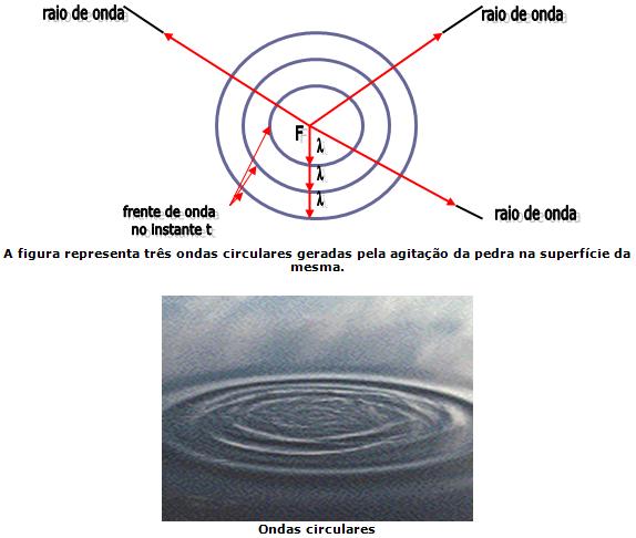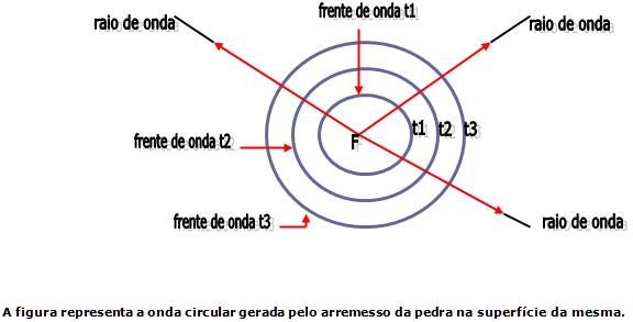 I) Ao arremessar uma pedra pequena na superfície de um lago, o mesmo sofrerá perturbações, que irá se propagar circularmente na superfície do lago, onde será uma onda circular, onde a frente da onda é uma circunferência. Logo podemos concluir que a onda circular é aquela em que sua frente é uma circunferência.
