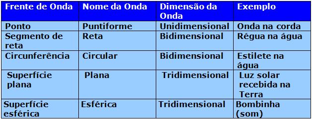 A frente de onda é considerada um conjunto dos pontos atingidos pela perturbação no instante considerado. Ela se movimenta com uma velocidade denominada velocidade de propagação da onda.