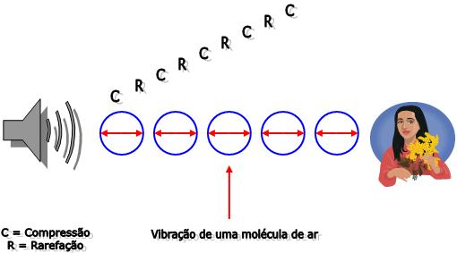 Na figura acima, um alto – falante produz um som que é detectado por um observador. O cone do alto-falante vibra, avançando e retrocedendo, empurrando sucessivamente o ar. Esses incrementos de pressão são transmitidos a outras regiões do ar, formando uma onda. Ao atingirem o ouvido da pessoa, eles fazem o tímpano vibrar, provocando assim a sensação da audição. Assim, o som é uma onda mecânica (onda de pressão), que exige um meio material para se propagar.