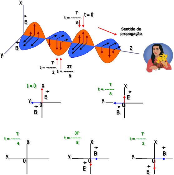 A figura acima, nos mostra uma onda eletromagnética. Podemos perceber que as direções dos campos elétricos (E) e magnéticos (B) são perpendiculares entre si e também perpendiculares à direção de propagação da onda. Na parte de baixo da figura, estão representados os vetores E e B como “vistos” pelo observador durante meio período da onda (t = T/2).