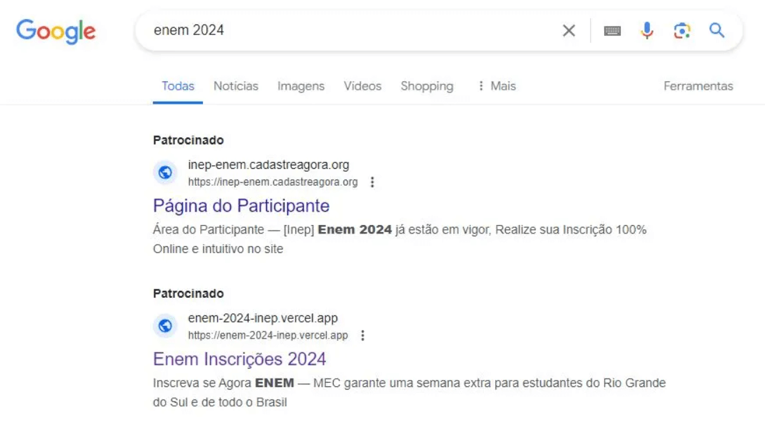 De acordo com o Inep, já foram identificadas diversas páginas falsas que estão sendo criadas por golpistas. Elas inclusive já foram encontradas em resultados de buscas feitos no Google, quando utilizados os termos “enem 2024”, por exemplo. Dentre os endereços que foram encontrados estavam inep2024-enem-inscricao-vercel-app e enem-inep2024.online.