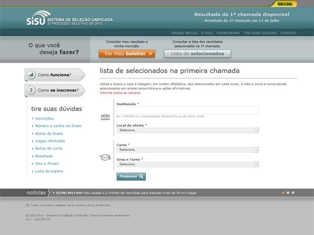 A lista de aprovação do Sistema de Seleção Unificada (Sisu) 2º semestre 2012 foi divulgada pelo Ministério da Educação (MEC) nesta segunda-feira (25). No total, são 30.548 vagas em diversas instituições de nível superior, 56 no total, entre federais e estaduais. As matrículas estarão disponíveis e deverão ser feitas no período de 29 de junho a 9 de julho. O resultado da primeira chamada pode ser conferido pelo estudante através da página do Sisu na internet.