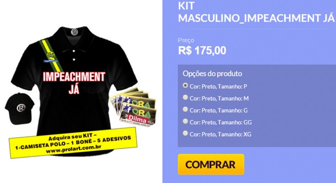O kit é composto por camiseta, com os dizeres “Impeachment Já”, cinco adesivos e 1 boné, pelo preço de 175 reais, sendo o material de excelente qualidade.