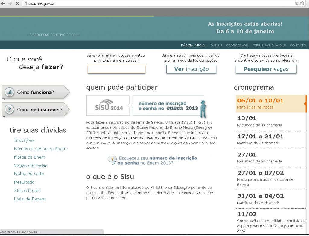 As inscrições estão sendo realizadas através do site do Sisu. Para entrar no sistema é necessário ter o número de inscrição no ENEM do ano passado, bem como a senha criada. No momento da inscrição os candidatos poderão selecionar até duas opções de cursos em diferentes instituições de ensino.