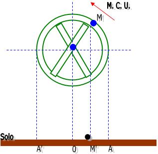 Portanto podemos concluir que ao ocorrer o M.C.U, irá fazer sua sombra M’ descrever no solo, o movimento retilíneo, oscilatório, com período T e freqüência f, sendo assim limitados pelos pontos A e A’, que são eqüidistantes do ponto O. É importante ressaltarmos que A e A’ são pontos de inversão do movimento oscilatório de M’.