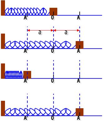 A figura a seguir mostra um bloco que está em repouso, colocado em um plano liso e horizontal. O bloco que está acoplado em uma mola elástica, com isso o bloco vai para o ponto A, deixando o local que está. Esse bloco ganha um movimento para a esquerda, tendo assim uma velocidade nula no ponto A’.