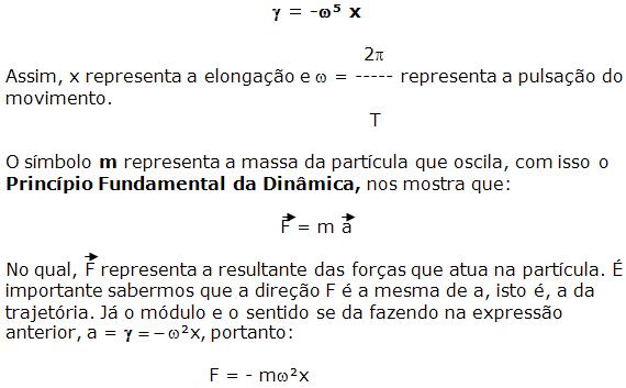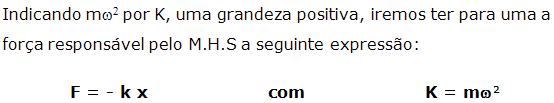 A equação indica a força de restituição, ou seja, força que possui sentido contrário ao deslocamento do seu ponto de ebulição, sendo assim do tipo elástica, ou seja, força que possui um módulo que é proporcional ao valor total do deslocamento do seu ponto de aplicação. Portanto podemos concluir que a força responsável pelo M.H. S é a força de restituição do tipo elástica.