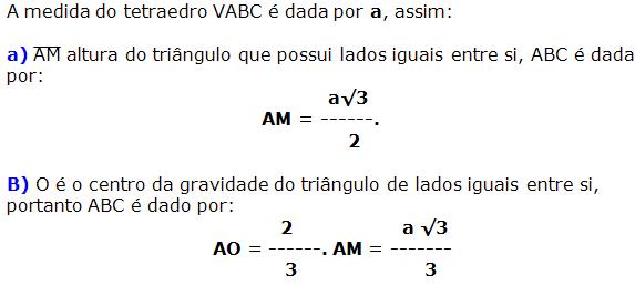 Volume de um tetraedro regular A medida do tetraedro VABC é dada por a, e o volume por V, assim:
