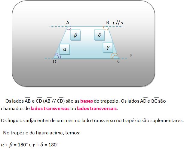 Todos os quadriláteros que possuem dois lados paralelos, recebem o nome de trapézio.