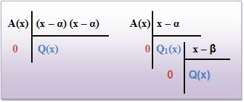Considerando A(x) divisível por (x . α) . (x . β), nesse caso podemos realizar duas divisões contínuas para obter o quociente, através do Dispositivo Prático de Briot-Ruffini.