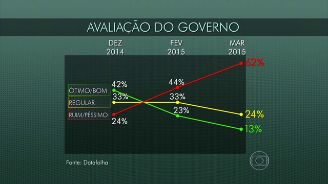 Na pesquisa mais recente do Datafolha somente 10% dos entrevistados avaliaram o governo como Bom ou Ótimo. Em dezembro passado esse índice representava 42%. O principal fator para a impopularidade de Dilma está no desempenho da economia brasileira.