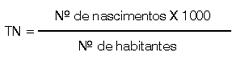 É a relação entre o número de nascimentos ocorridos em um ano e o número de habitantes. Obtemos essa taxa tomando os nascimentos ocorridos durante um ano, multiplicando-se por 1000 e dividindo o resultado pela população absoluta, ou seja: