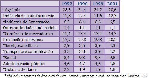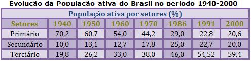 Mesmo com a participação predominante do setor primário, na década de 70 o setor terciário passou a representar a maior absorção de ativos, em razão do desenvolvimento do país conjugado à urbanização da população, que intensificou a exigência das atividades de serviços; e o setor secundário teve um aumento considerável entre 1970 e 1990, pois nesta fase o Brasil passou por uma fase de grande desenvolvimento industrial, conhecido como Milagre Brasileiro.