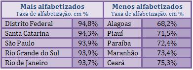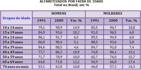 O índice nacional de analfabetismo, valido apenas para pessoas com mais de 15 anos, teve uma queda considerável de 20,07% em 1991 para 13,63% em 2000.
