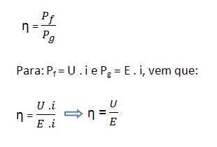 O rendimento elétrico de um gerador é dado pela relação entre a potência elétrica útil fornecida ao circuito externo e sua potência elétrica total gerada: