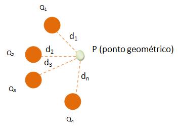 Vejamos um campo elétrico criado por n cargas elétricas puntiformes representadas por Q1, Q2, Q3… Qn, sendo que neste campo existe também um ponto geométrico representado por P.