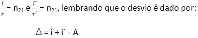 Se tratando de ângulos de incidência, representados por i, e ângulo de refringência representado por A de alguns graus de medida até mais ou menos cinco graus, podemos utilizar a Lei de Kepler, vejamos:
