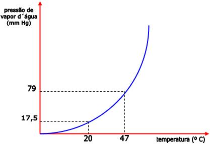 Conforme a temperatura aumenta, ocorre também o aumento na pressão de vapor do líquido. Portanto, sob uma temperatura de 27°C, a pressão máxima de vapor da água é de 26mm de Hg. E sob a temperatura de 47°C a pressão máxima de vapor da água é de 79 mm Hg. O diagrama abaixo representa essa relação entre pressão de vapor e temperatura.