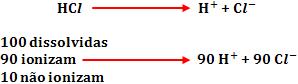 Considere que 100 moléculas de HCl foram dissolvidas em água. Sendo que somente 90 moléculas se ionizam, formando 90 cátions H+ e 90 ânions Cl–. Restam 10 moléculas de HCl que não sofreram a ionização.