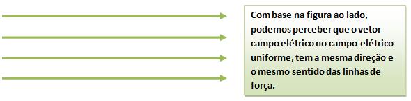 Quando falamos de campo elétrico uniforme, podemos considerar que quando o campo elétrico for uniforme, ele terá linhas paralelas, com o mesmo sentido, onde elas estarão uniformemente distribuídas. Vejamos a ilustração:
