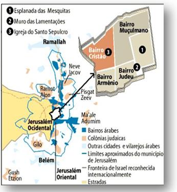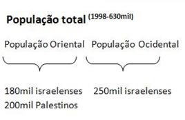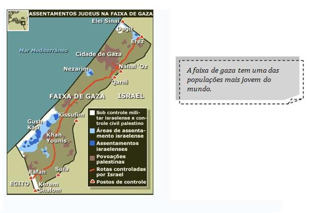 Podemos observar a seguir no mapa a ocupaçao de Palestinos e Iraelenses na Faixa de Ganz.