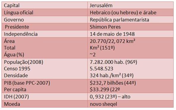 Israel – Foi proclamado em 14 de maio de 1948. Quase todos os habitantes são judeus, a língua falada é o hebraico e a religião é o judaísmo.