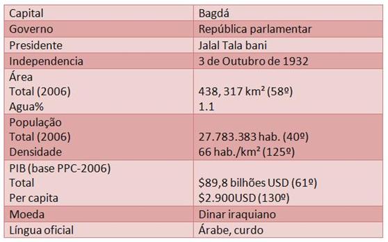 Iraque – É um país do Médio Oriente, tendo ao norte a Turquia, ao leste o Irão, ao sul o Golfo Pérsico, Kuwait e Arábia Saudita e ao oeste a Jordânia e Síria. Sua maior parte é desértica, porém as regiões dos Rios Tigre e Eufrates são férteis para a agricultura. Hoje em dia sua principal economia é a exportação de petróleo. Isso só ocorreu devido a guerra com os EUA, por que antes sua economia dividia-se com a grande exportação de tamaras, que deixou de ser exportada devido ao bloqueio internacional.
