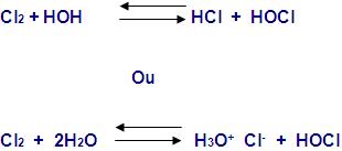 O cloro produz íons cloreto e hipoclorito,quando reage em água (0,1 mol/litro), porém ele é pouco solúvel.