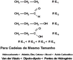 Quanto maior for a cadeia carbônica, maior será a superfície de contato entre as moléculas e o número de ligações intermoleculares. Com isso, a energia necessária para a mudança de estado (ruptura de ligações) será maior.