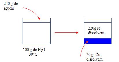 Em 100g de água é possível dissolver 220g de açúcar, se a água estiver aquecida a 30ºC e tentarmos dissolver mais que 220g de açúcar o excesso fica depositado no fundo do recipiente.