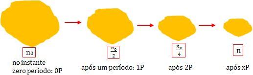Para cada período “P” que se decorre, há uma redução da metade da amostra que vai se reduzindo incessantemente até que atingir uma quantidade muito pequena.