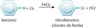 Quando há FeX3 ou AlX3 ( X ≡ Cl ou Br), o cloro e o bromo age como catalisador, manifestando reações de substituições com o benzeno, onde o iodo não irá reagir com esses hidrocarbonetos.