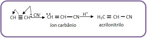 A adição de HCN a alquino é necleofílica, pois o ataque inicial a um carbono insaturado ocorre através de um íon negativo, que é atraído pelo núcleo positivo do carbono, estabelecendo assim um íon negativo (carbônio), junto com a carga negativa em átomo de carbono.