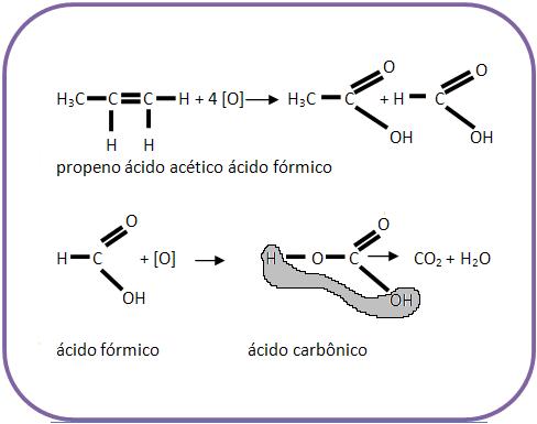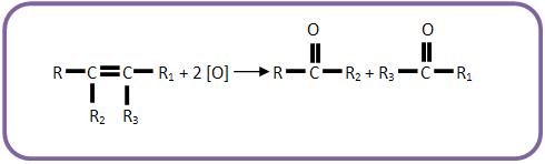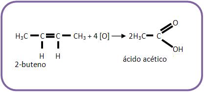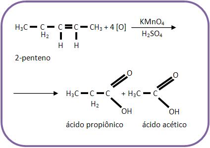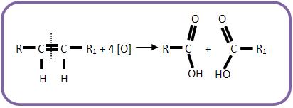 Se o alceno for submetido a um oxidante enérgico e sofrer oxidação com ruptura da dupla ligação, poderá haver a formação de ácidos carboxílicos, cetonas ou gás carbônico: