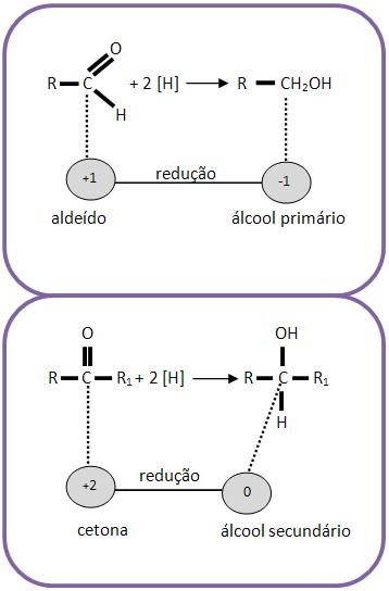 Através da redução com o hidrogênio, um aldeído pode produzir álcool primário, já a cetona pode produzir álcool secundário.