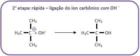 É difícil o ataque do OH– pelo lado oposto, pelo fato de haver um impedimento estérico (espacial) disposto pelos 3 grupos. Portanto, podemos concluir que o mecanismo é diferente e ocorre da seguinte maneira, vejamos: