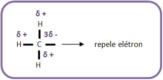Pelo fato do carbono ser mais eletronegativo que o hidrogênio, na ligação C-H ele apresenta uma carga parcial negativa. Por este motivo, o radical Áquila (R-), representado na figura abaixo, irá repelir elétrons. Vejamos: