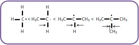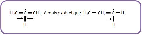 Caso o radical apresente átomos de carbono, contendo menos de oito elétrons na camada de valência, ele se tornará instável, pois quanto maior o número de radicais alquilas ligados a esse átomo de carbono, mais estável será o radical.