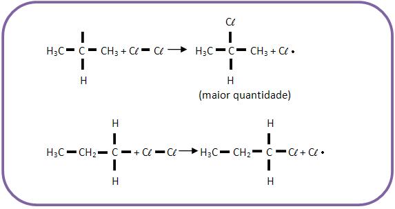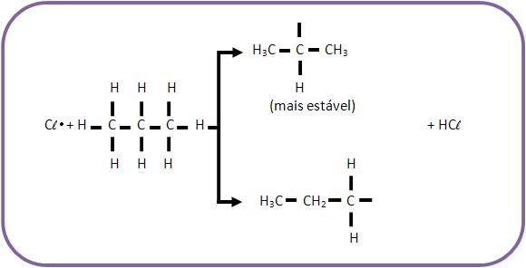 Quando há uma reação de substituição por radicais livres, o radical mais estável irá se formar em maior quantidade. Como exemplo, podemos citar a reação de propano com cloro, onde forma-se maior quantidade do radical isopropil do que propil.