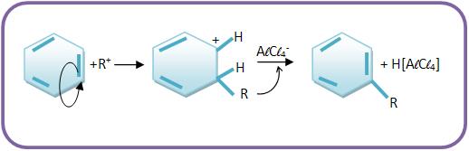 b) O benzeno é atacado pelo íon positivo R+ (eletrofílico)