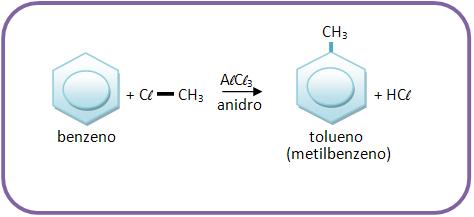 Um cloreto de alcoíla (R – Cl) reagirá com o benzeno, na presença de uma pequena quantidade de cloreto de alumínio anidro, para resultar em alquibenzeno.
