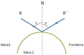 Sendo RI um raio de luz incidente, onde I é o ponto de incidência da luz, IR´ é considerado o correspondente do raio de luz que é refletido e IN é uma reta normal à fronteira no ponto I.