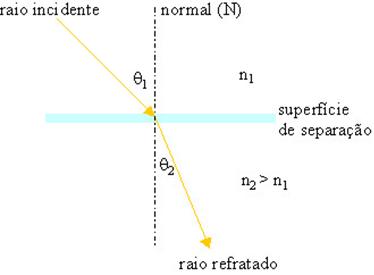 Figura 5 – Refração de um raio quando passa de um meio (1) menos refringente para uma meio (2), mais refringente.
