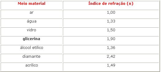 Observação: Os valores dos índices de refração da tabela 1 são valores para uma mesma radiação (mesma cor).
