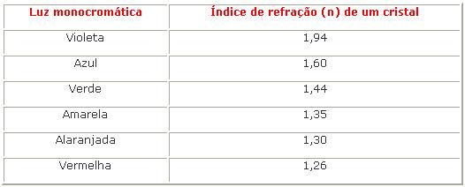Dependendo da cor da luz incidente no dioptro, temos diferentes índices de refração para o mesmo meio (tabela 2).