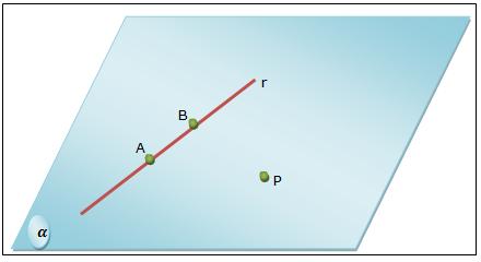 Determinamos o plano α através dos pontos A, B e P por não serem colineares. O plano α possui além do ponto P o ponto r por conter dois de seus pontos diferentes A e B (postulado da inclusão).