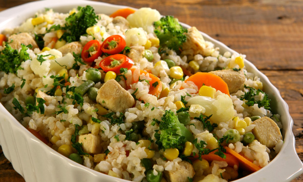 O arroz branco pode ser alterado pelo arroz integral. Cozinhe junto com o arroz vários legumes como milho, ervilha, cenoura, pimentão e tomate. Você pode acrescentar o legume que preferir. O importante é dar novo sabor e aroma ao arroz normal de todo dia. Nessa receita você pode pedir para que seu filho escolha os legumes e ajude você a preparar o arroz.