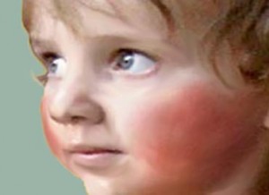 - Manchas em forma de maculopápulas (bochecha vermelha)